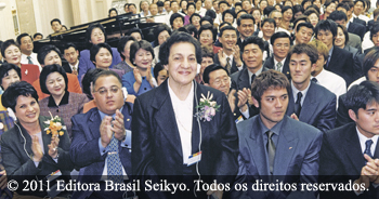 CONSIDERAÇÃO. Na mensagem, o presidente Ikeda louva os esforços da Sra. Magdalena Landi, DF da CRJ, que se dedica incansavelmente na propagação do Budismo na cidade maravilhosa. Ela tem mais de 640 Chakubuku. Foto tirada durante Curso de Aprimoramento da SGI, no Japão, em 8 de janeiro de 2002